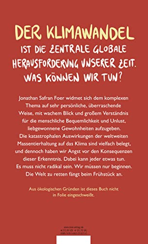 Mit seinem Bestseller »Tiere essen« hat Jonathan Safran Foer weltweit Furore gemacht: Viele seiner Leser wurden nach der Lektüre Vegetarier oder haben zumindest ihre Ernährung überdacht. Nun nimmt Foer sich des grössten Themas unserer Zeit an: dem Klimawandel. Der Klimawandel ist zu abstrakt, deshalb lässt er uns kalt. Foer erinnert an die Kraft und Notwendigkeit gemeinsamen Handelns und führt dazu anschaulich viele gelungene Beispiele an, die uns als Ansporn dienen sollen. Wir können die Welt nicht retten, ohne einem der grössten CO2- und Methangas-Produzenten zu Leibe zu rücken, der Massentierhaltung. Foer zeigt einen Lösungsansatz auf, der niemandem viel abverlangt, aber extrem wirkungsvoll ist: tierische Produkte nur einmal täglich zur Hauptmahlzeit.
