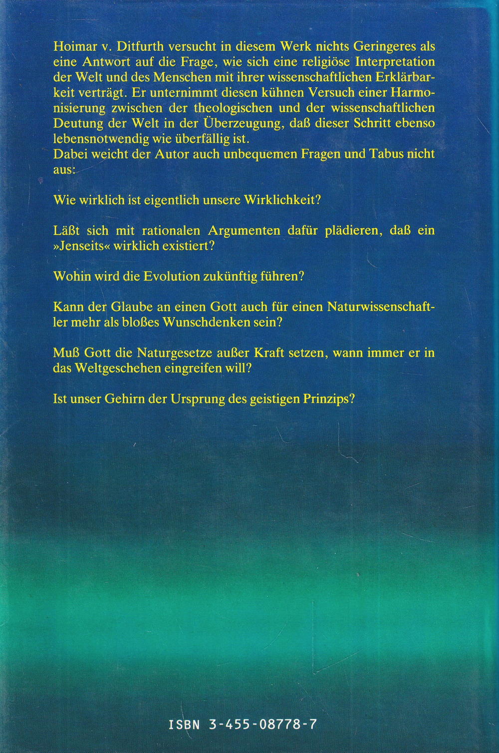 Hoimar v. Ditfurth versucht in diesem Werk nichts Geringeres als eine Antwort auf die Frage, wie sich eine religiöse Interpretation der Welt und des Menschen mit ihrer wissenschaftlichen Erklärbarkeit verträgt. Er unternimmt diesen kühnen Versuch einer Harmonisierung zwischen der theologischen und der wissenschaftlichen Deutung der Welt in der Überzeugung, dass dieser Schritt ebenso lebensnotwendig wie überfällig ist.