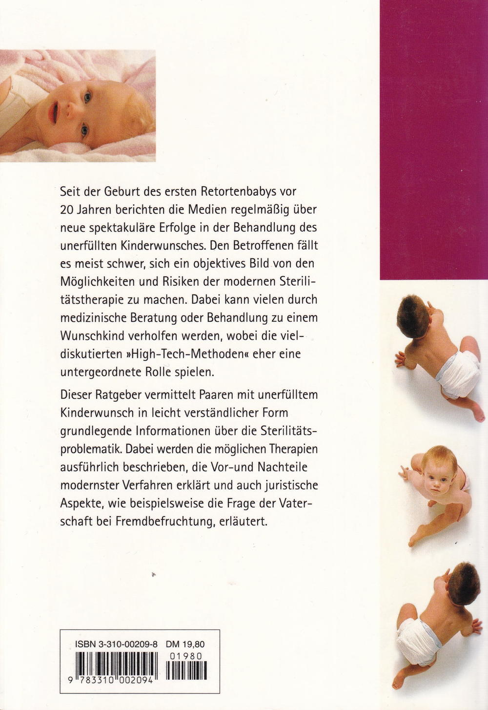 Dieser Ratgeber vermittelt Paaren mit unerfülltem Kinderwunsch in leicht verständlicher Form grundlegende Informationen über die Sterilitätsproblematik. Dabei werden die möglichen Therapien ausführlich beschrieben, die Vor-und Nachteile modernster Verfahren erklärt und auch juristische Aspekte, wie beispielsweise die Frage der Vaterschaft bei Fremdbefruchtung, erläutert.