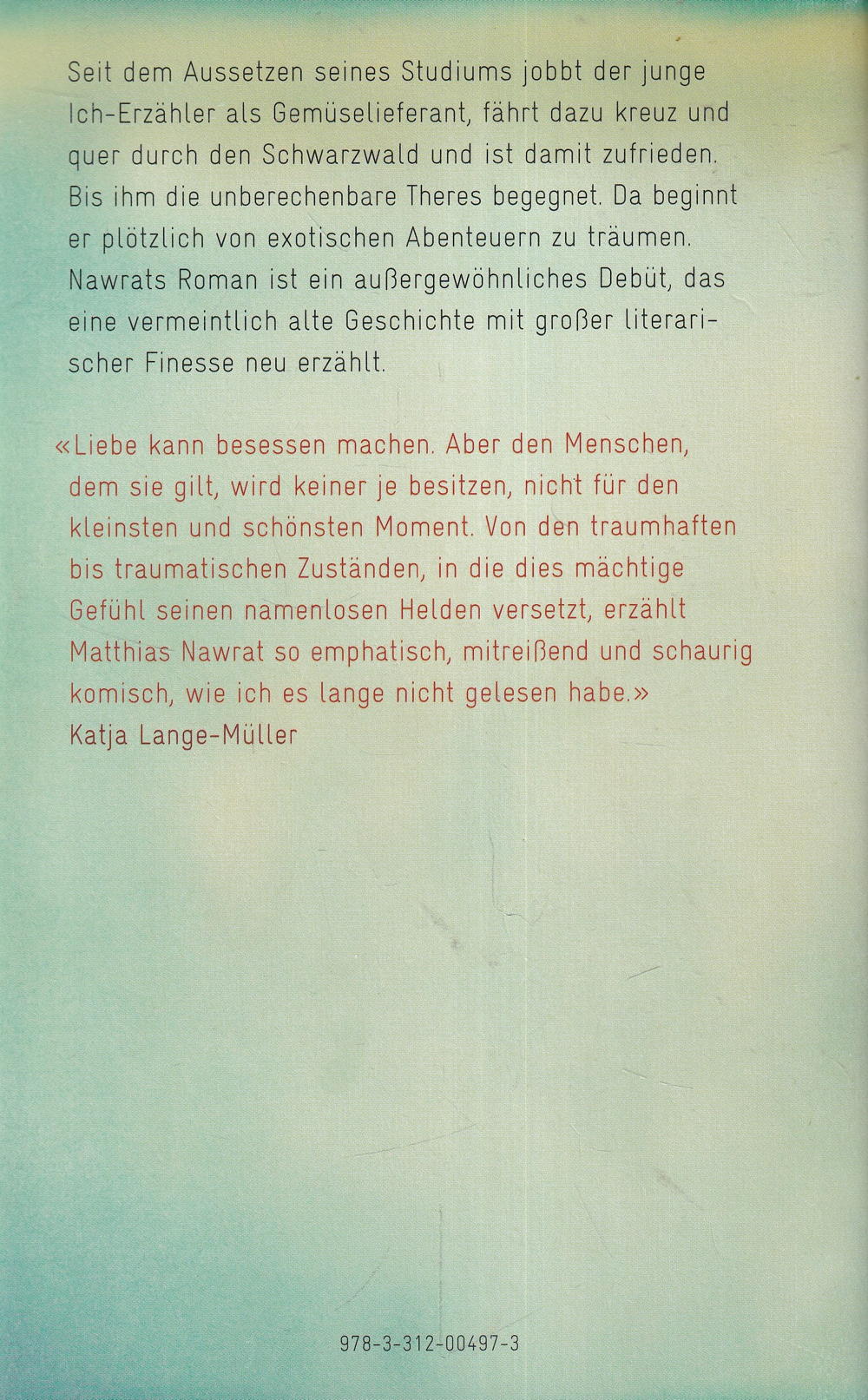 Seit dem Abbruch seines Studiums jobbt der Aussenseiter Benz als Gemüsefahrer und ist damit zufrieden. Bis ihm Theres begegnet. Da schmiedet Benz plötzlich ausgefallene Pläne und unternimmt in Gedanken waghalsige Expeditionen, um ihre Liebe zu gewinnen. Schliesslich gewährt sie ihm eine gemeinsame Nacht, aber danach ist sie plötzlich verschwunden. Nawrats Roman ist ein aussergewöhnliches und starkes Debüt über eine Generation von Unentschlossenen, über die grosse Liebe und ihr manchmal atemberaubend hohes Risiko - eine vermeintlich alte Liebesgeschichte mit grosser literarischer Finesse neu erzählt.
