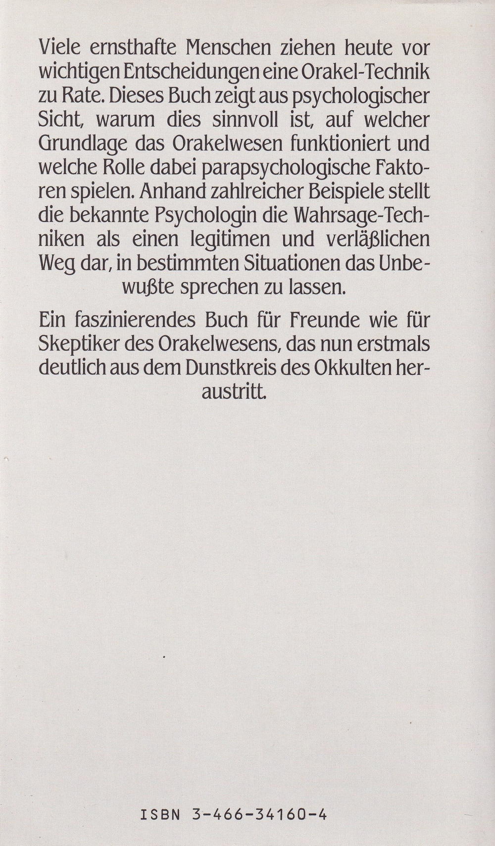 Viele ernsthafte Menschen ziehen heute vor wichtigen Entscheidungen eine Orakel-Technik zu Rate. Dieses Buch zeigt aus psychologischer Sicht, warum dies sinnvoll ist, auf welcher Grundlage das Orakelwesen funktioniert und welche Rolle dabei parapsychologische Faktoren spielen. Anhand zahlreicher Beispiele stellt die bekannte Psychologin die Wahrsage-Techniken als einen legitimen und verlässlichen Weg dar, in bestimmten Situationen das Unbewusste sprechen zu lassen.