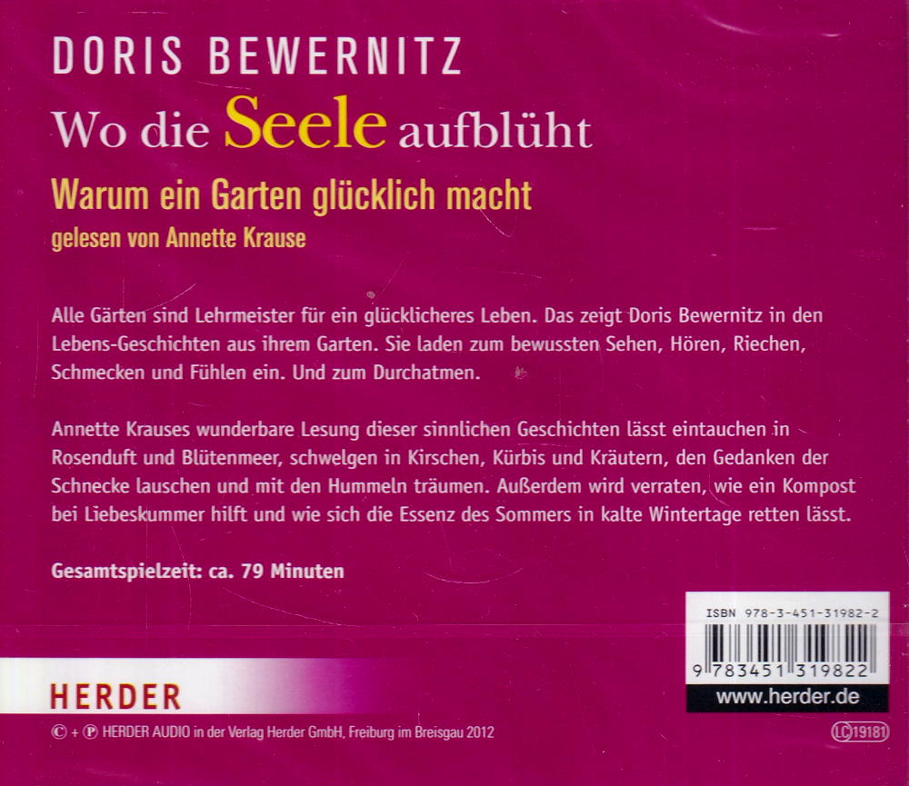 Warum ein Regenwurm Geduld lehrt, der Kosmos des Kompostes, wozu eine Kohlmeise einen Hund braucht, die Namen der Rosen und die Logik der Brennnessel Wieviel Sinnbildliches gibt es in der Natur! Noch dazu, wenn es sich um ein kleines überschaubares Stück Natur handelt, das eng mit dem Menschen verbunden ist. Doris Bewernitz erzählt Lebens-Geschichten aus ihrem Garten. Aus jedem Garten. Denn alle Gärten sind Lehrmeister für ein glücklicheres Leben.