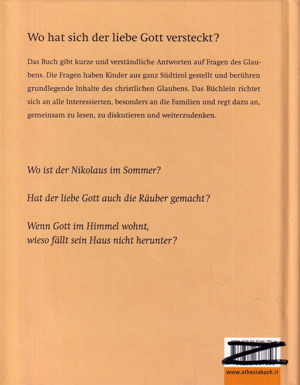Das Buch gibt kurze und verständliche Antworten auf Fragen des Glaubens. Die Fragen haben Kinder aus ganz Südtirol gestellt und berühren grundlegende Inhalte des christlichen Glaubens. Das Büchlein richtet sich an alle Interessierten, besonders an die Familien und regt dazu an, gemeinsam zu lesen, zu diskutieren und weiterzudenken.