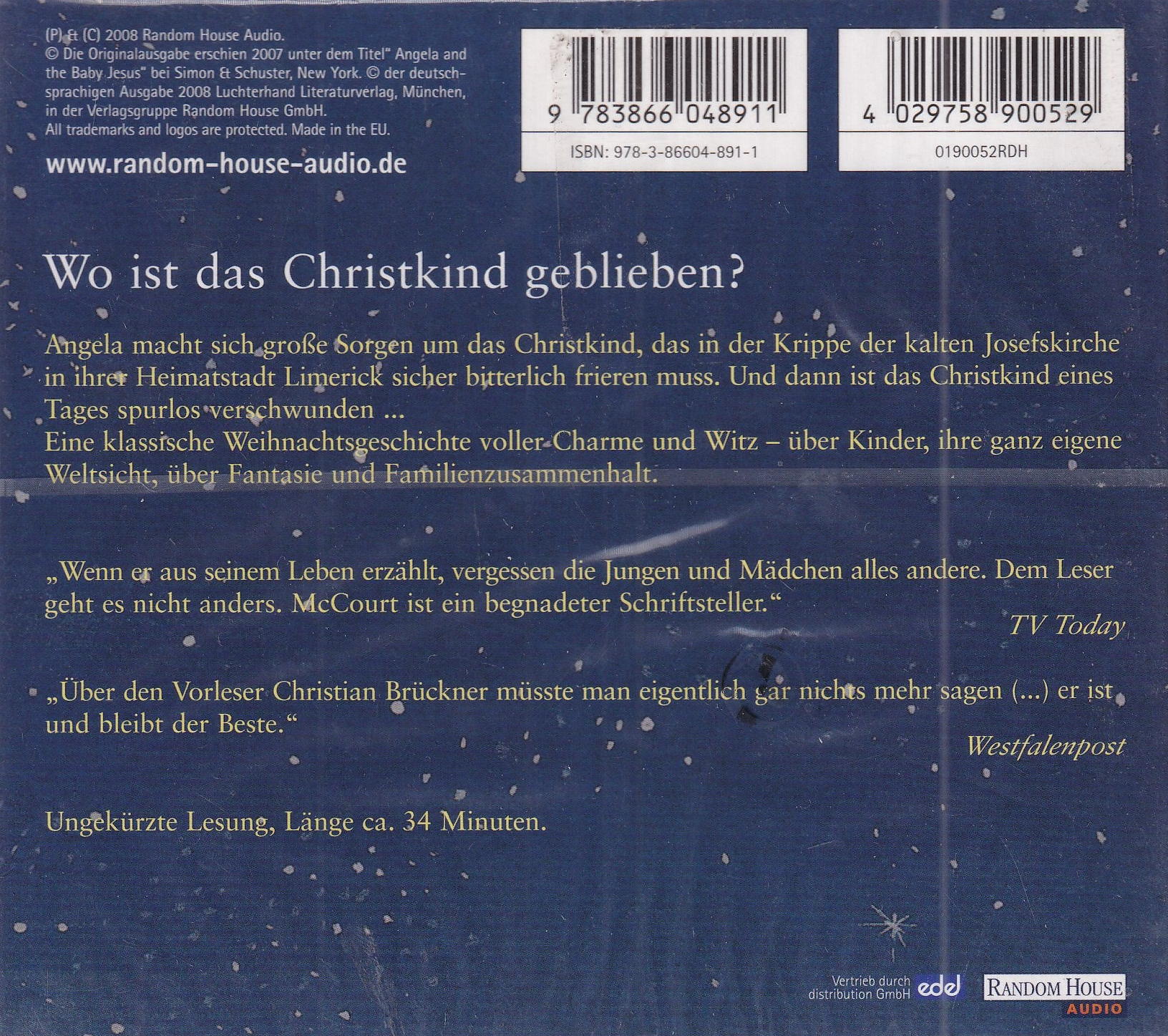 Angela macht sich grosse Sorgen um das Christkind, das in der Krippe der kalten Josefskirche in ihrer Heimatstadt Limerick sicher bitterlich frieren muss. Und dann ist das Christkind eines Tages spurlos verschwunden... Eine klassische Weihnachtsgeschichte voller-Charme und Witz – über Kinder, ihre ganz eigene Weltsicht, über Fantasie und Familienzusammenhalt.