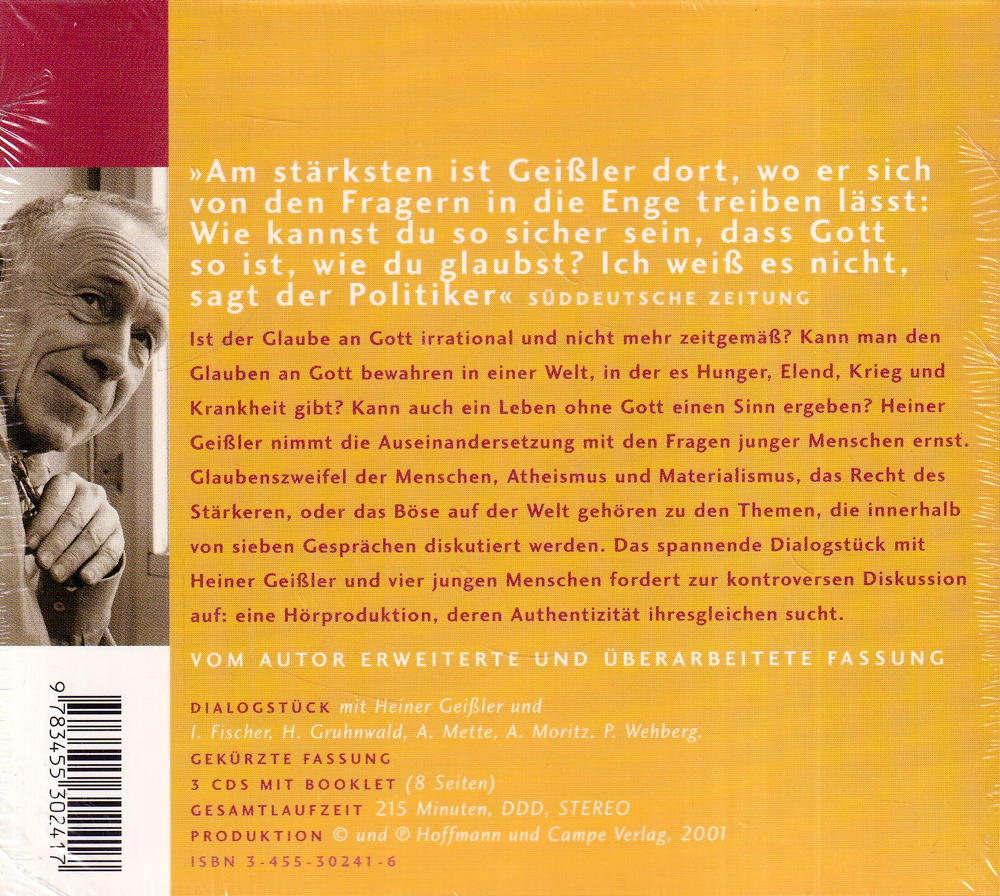 Glaubenszweifel der Menschen, Atheismus und Materialismus, das Recht des Stärkeren, oder das Böse auf der Welt gehören zu den Themen, die innerhalb von sieben Gesprächen diskutiert werden. Das spannende Dialogstück mit Heiner Geissler und vier jungen Menschen fordert zur kontroversen Diskussion auf: eine Hörproduktion, deren Authentizität ihresgleichen sucht.