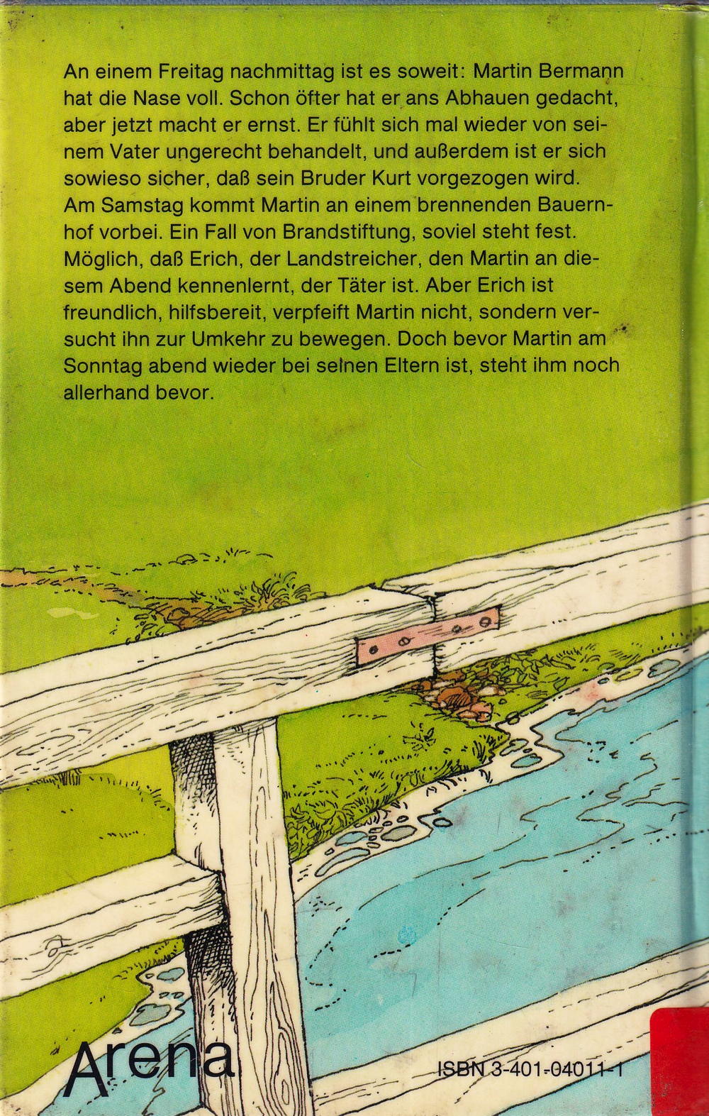 An einem Freitag nachmittag ist es soweit: Martin Bermann hat die Nase voll. Schon ofter hat er ans Abhauen gedacht, aber jetzt macht er ernst. Er fühlt sich mal wieder von seinem Vater ungerecht behandelt, und ausserdem ist er sich sowieso sicher, dab sein Bruder Kurt vorgezogen wird Am Samstag kommt Martin an einem brennenden Bauernhof vorbei. Ein Fall von Brandstiftung, soviel steht fest Möglich, dab Erich, der Landstreicher, den Martin an diesem Abend kennenlernt der Tater ist Aber Erich ist freundlich, hilfsbereit, verpfeift Martin nicht, sondern ver- sucht ihn zur Umkehr zu bewegen. Doch bevor Martin am Sonntag Abend wieder bei seinen Eltern ist, steht ihm noch allerhand bevor