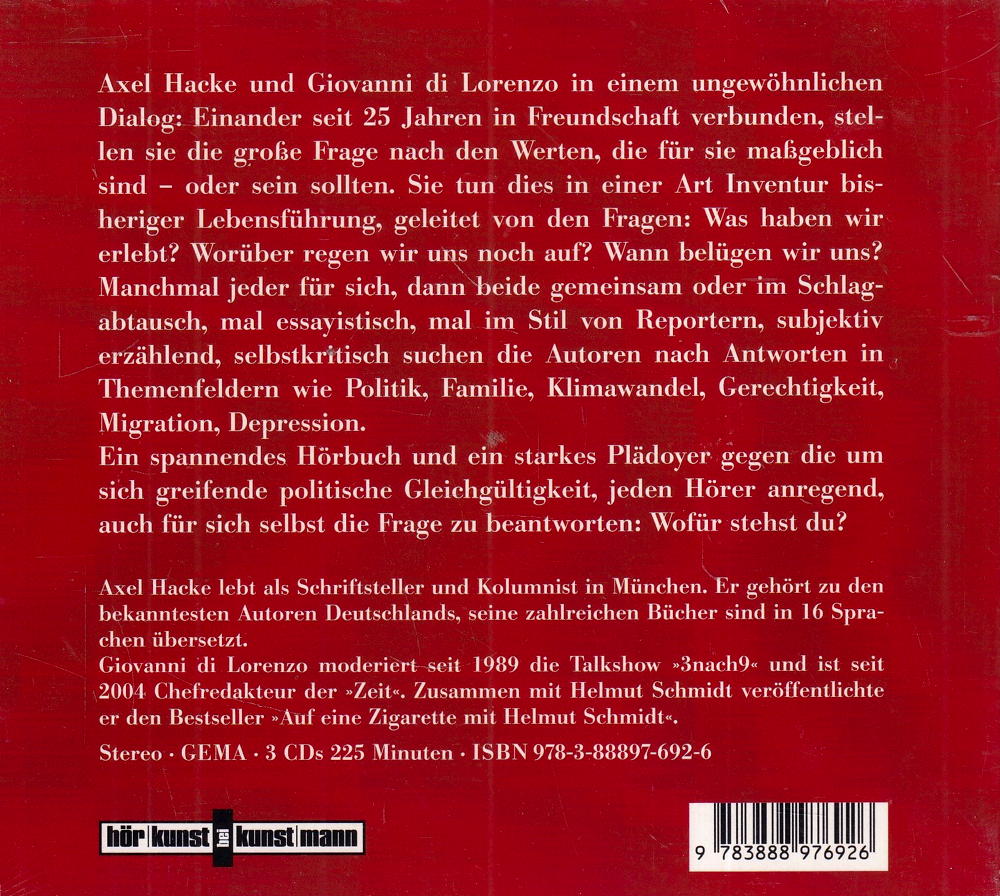 In diesem spannenden Hörbuch treten Axel Hacke und Giovanni di Lorenzo in einen ungewöhnlichen Dialog. Sie erzählen und reflektieren, was im Leben und was in der Gesellschaft wichtig ist. Es geht ihnen nicht um einen allgemeinen Tugendkatalog, wie er neuerdings en vogue ist, sondern um eine Inventur bisheriger Lebensführung, geleitet von den Fragen: Was haben wir erlebt? Worüber regen wir uns noch auf? Wo haben wir uns davongestohlen? Wann belügen wir uns? Fragen, die in Zeiten des unübersehbaren Rückzugs ins Private und zunehmender Politikverdrossenheit immer wichtiger werden. Wofür steht man?