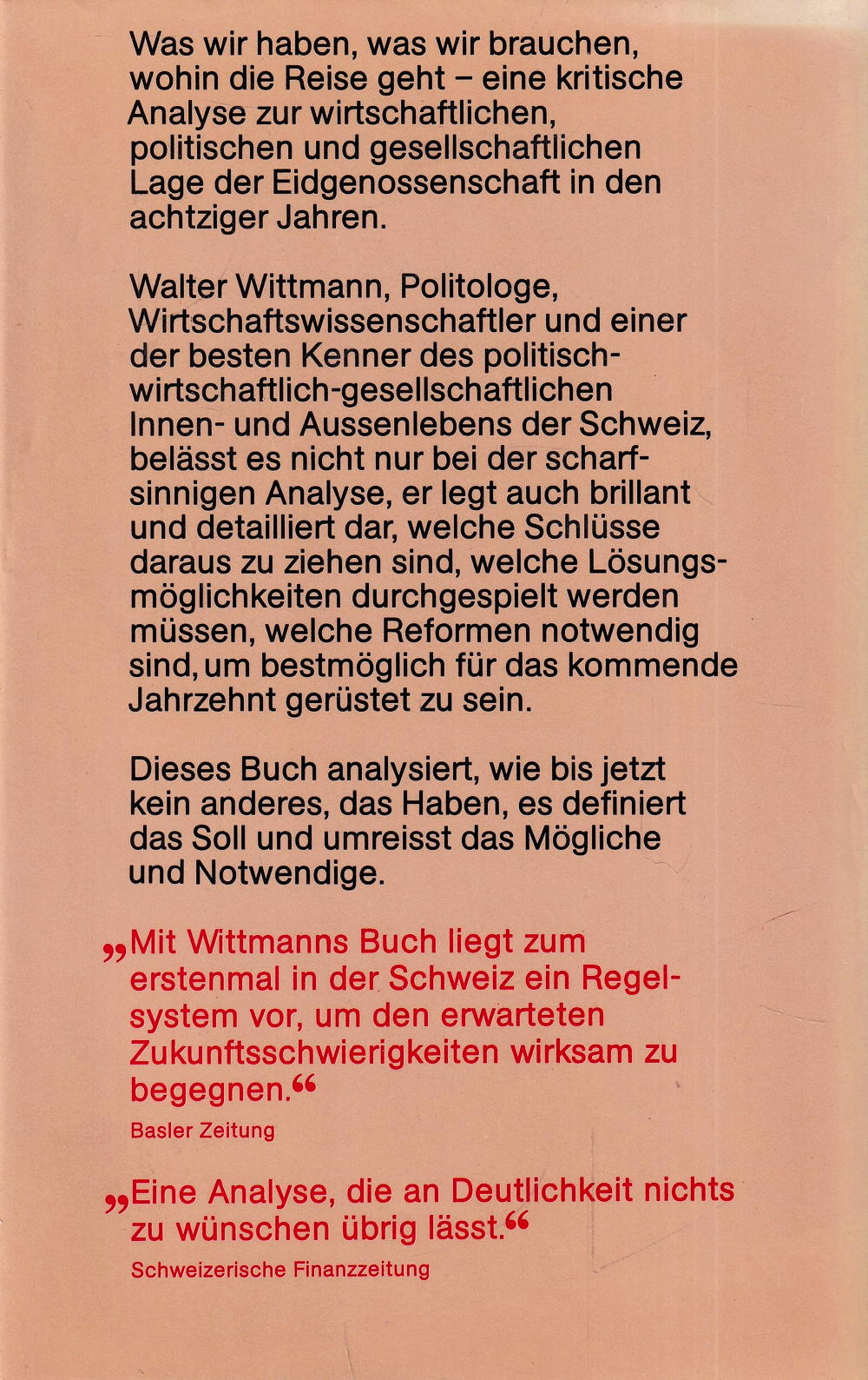 Walter Wittmann, Politologe, Wirtschaftswissenschaftler und einer der besten Kenner des politischwirtschaftlich-gesellschaftlichen Innen- und Aussenlebens der Schweiz, belässt es nicht nur bei der scharfsinnigen Analyse, er legt auch brillant und detailliert dar, welche Schlüsse daraus zu ziehen sind, welche Lösungsmöglichkeiten durchgespielt werden müssen, welche Reformen notwendig sind, um bestmöglich für das kommende Jahrzehnt gerüstet zu sein.