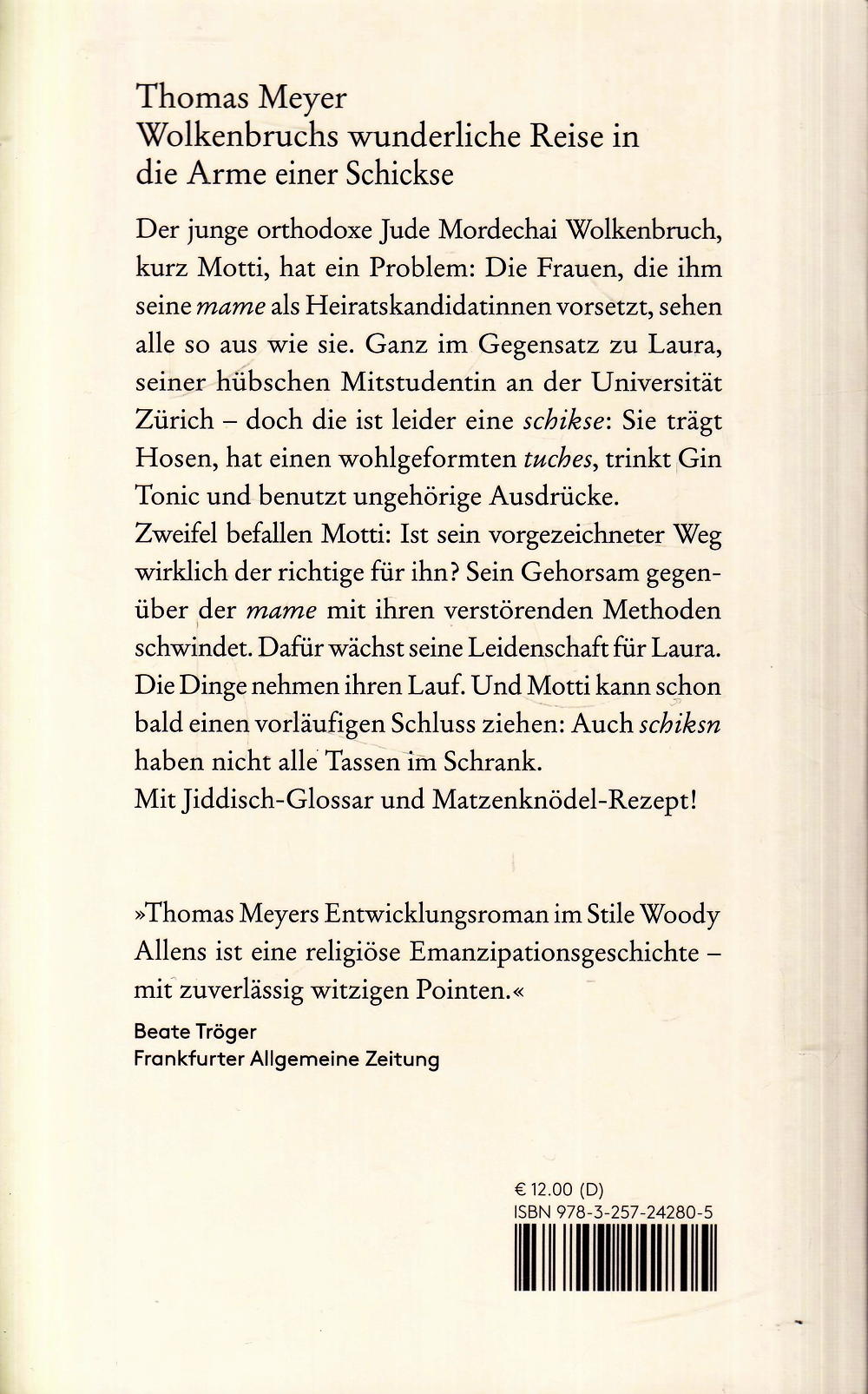Motti Wolkenbruch ist ein junger orthodoxer Jude aus Zürich, der sich zum Entsetzen seiner Familie in eine Schickse, eine Nichtjüdin, verliebt. Ein Einblick in eine unbekannte Welt, eine berührende und schelmische Geschichte – mit jiddischem Wortwitz und unwiderstehlichem Humor.
