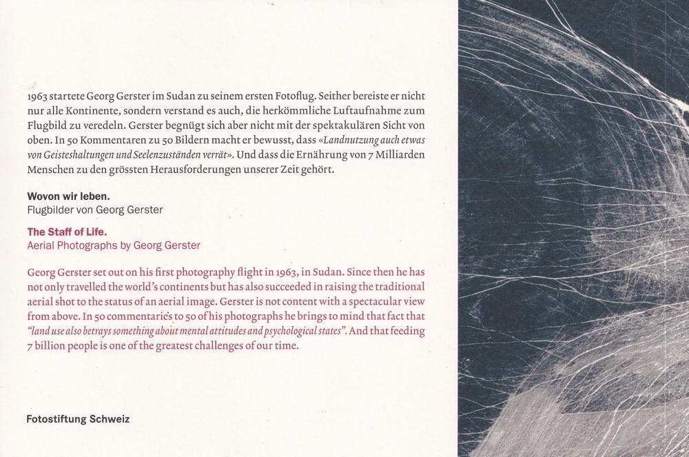 1963 startete Georg Gerster im Sudan zu seinem ersten Fotoflug. Seither bereiste er nicht nur alle Kontinente, sondern verstand es auch, die herkömmliche Luftaufnahme zum Flugbild zu veredeln. Gerster begnügt sich aber nicht mit der spektakulären Sicht von oben. In 50 Kommentaren zu 5o Bildern macht er bewusst, dass «Landnutzung auch etwas von Geisteshaltungen und Seelenzuständen verrät». Und dass die Ernährung von 7 Milliarden Menschen zu den grössten Herausforderungen unserer Zeit gehört.