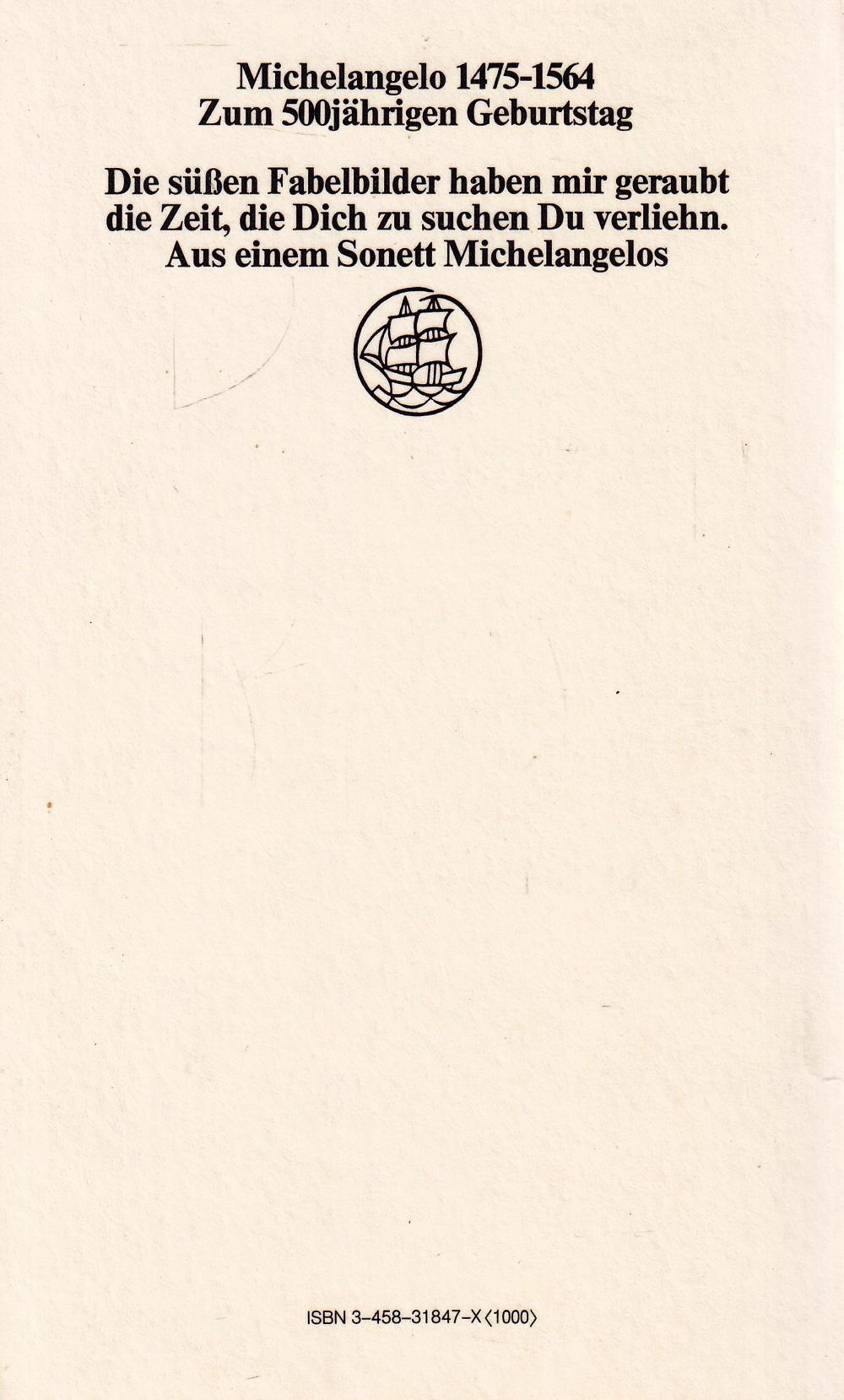 Michelangelo 1475-1564 Zum 500 jährigen Geburtstag Die süssen Fabelbilder haben mir geraubt die Zeit, die Dich zu suchen Du verliehn.