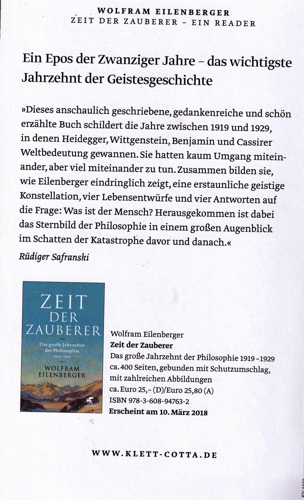 "Dieses schön erzählte Buch schildert die Jahre zwischen 1919 und 1929, in denen Heidegger, Wittgenstein, Benjamin und Cassirer Weltbedeutung gewannen. Zusammen bilden sie eine erstaunliche geistige Konstellation, vier Lebensentwürfe und vier Antworten auf die Frage: Was ist der Mensch? Herausgekommen ist dabei das Sternbild der Philosophie in einem grossen Augenblick im Schatten der Katastrophen davor und danach."