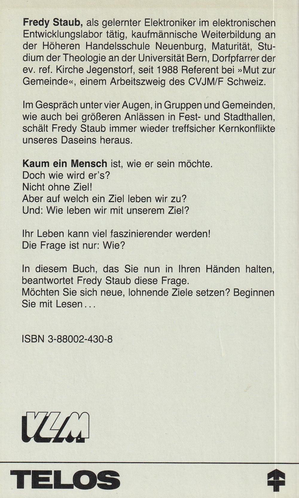 Fredy Staub, als gelernter Elektroniker im elektronischen Entwicklungslabor tätig, kaufmännische Weiterbildung an der Höheren Handelsschule Neuenburg, Maturität, Studium der Theologie an der Universität Bern, Dorfpfarrer der ev. Ref. Kirche Jegenstorf, seit 1988 Referent bei »Mut zur Gemeinde«, einem Arbeitszweig des CVJM/F Schweiz.