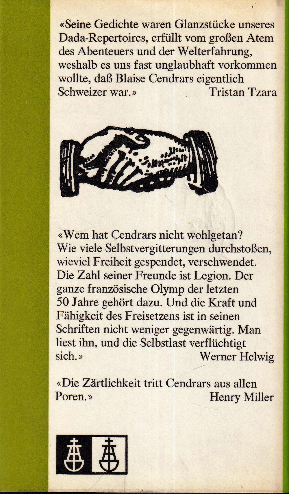 «Seine Gedichte waren Glanzstücke unseres Dada-Repertoires, erfüllt vom grossen Atem des Abenteuers und der Welterfahrung, weshalb es uns fast unglaubhaft vorkommen wollte, dass Blaise Cendrars eigentlich Schweizer war. »