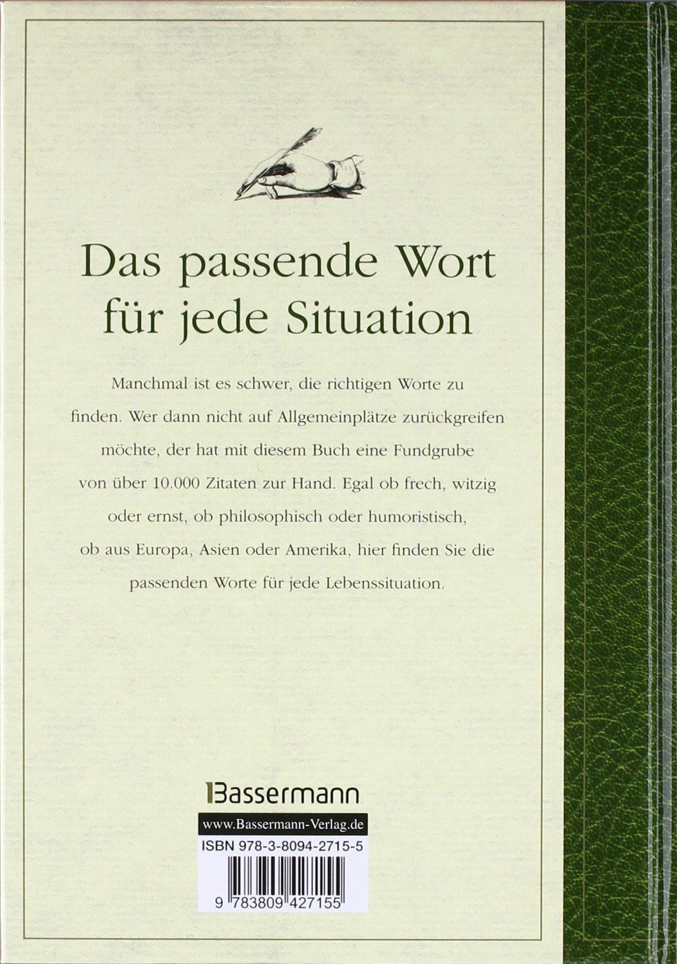 Manchmal ist es schwer, eigene Worte zu finden. Wer dann nicht auf Allgemeinplätze zurückgreifen möchte, der hat mit diesem Buch einen Schatz zur Hand. Egal ob frech, witzig oder ernst, ob philosophisch oder humoristisch, ob aus Europa, Asien oder Amerika, hier werden Lebenssituationen in passende Worte gefasst und man ist für alle Situationen gewappnet.