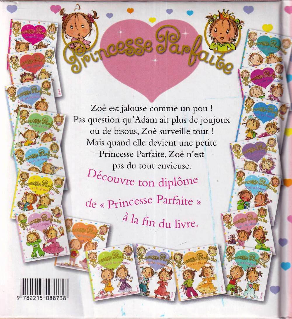 Dans la collection Princesse Parfaite un nouveau titre Zoé est jalouse, une collection qui fait craquer les parents et les enfants ! Une façon ludique de parler d'éducation et de comportement. Zoé est une adorable petite fille qui n'en fait qu à sa tête. Mais comme toutes les petites filles, elle peut aussi devenir une Princesse Parfaite, qui fait tout bien comme il faut. Découvre ton diplôme de Princesse Parfaiteà la fin du livre.