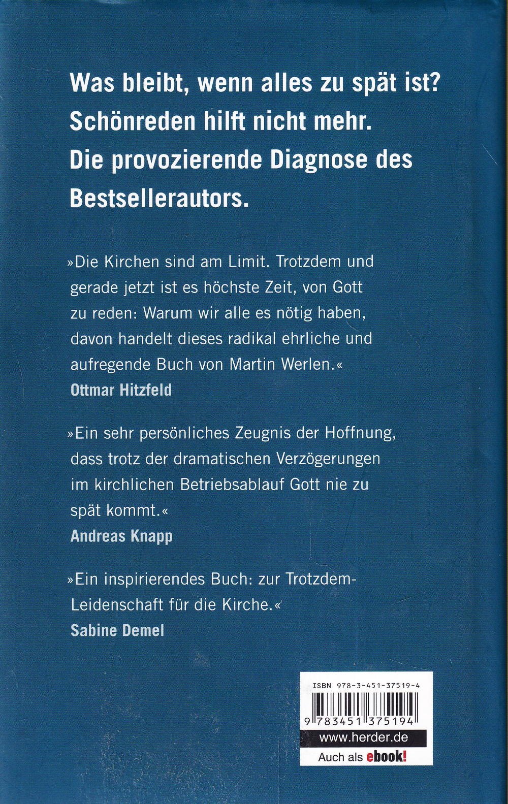 Ein dramatisches Ereignis, eine wahre persönliche Begebenheit, die den Autor fast aus der Bahn geworfen hat, steht im Zentrum dieses autobiographisch geprägten Buches. Was trägt in einer solchen Situation? Was sagt etwa die Geschichte vom Propheten Jona? Sie durchzieht dieses Buch wie ein roter Faden. Loslassen kann schmerzen. Aber es hilft nur, nach innen und in die Tiefe zu gehen, Glauben neu zu entdecken - an der Seite auch jener Menschen, in deren Leben "alles zu spät" ist. Und es hilft die zentrale Erfahrung: Christliche Berufung ist heute ganz radikal neu gefordert.