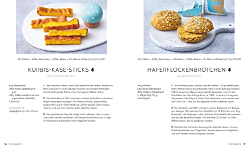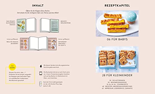 Die Snacks sind allesamt zuckerfrei und werden durch frisches Obst und Gemüse, Nüsse, Saaten, Vollkorngetreide sowie Milchprodukte und Hülsenfrüchte zu gesundem Fingerfood kombiniert. Das Baby Kochbuch kann ab Beikoststart genutzt werden und begleitet durch die ganze Kindheit – denn die Autorinnen präsentieren echte Lieblingsrezepte: Birnenwölkchen Müsliquadrate KiBa-Muffins Pizzabrötchen