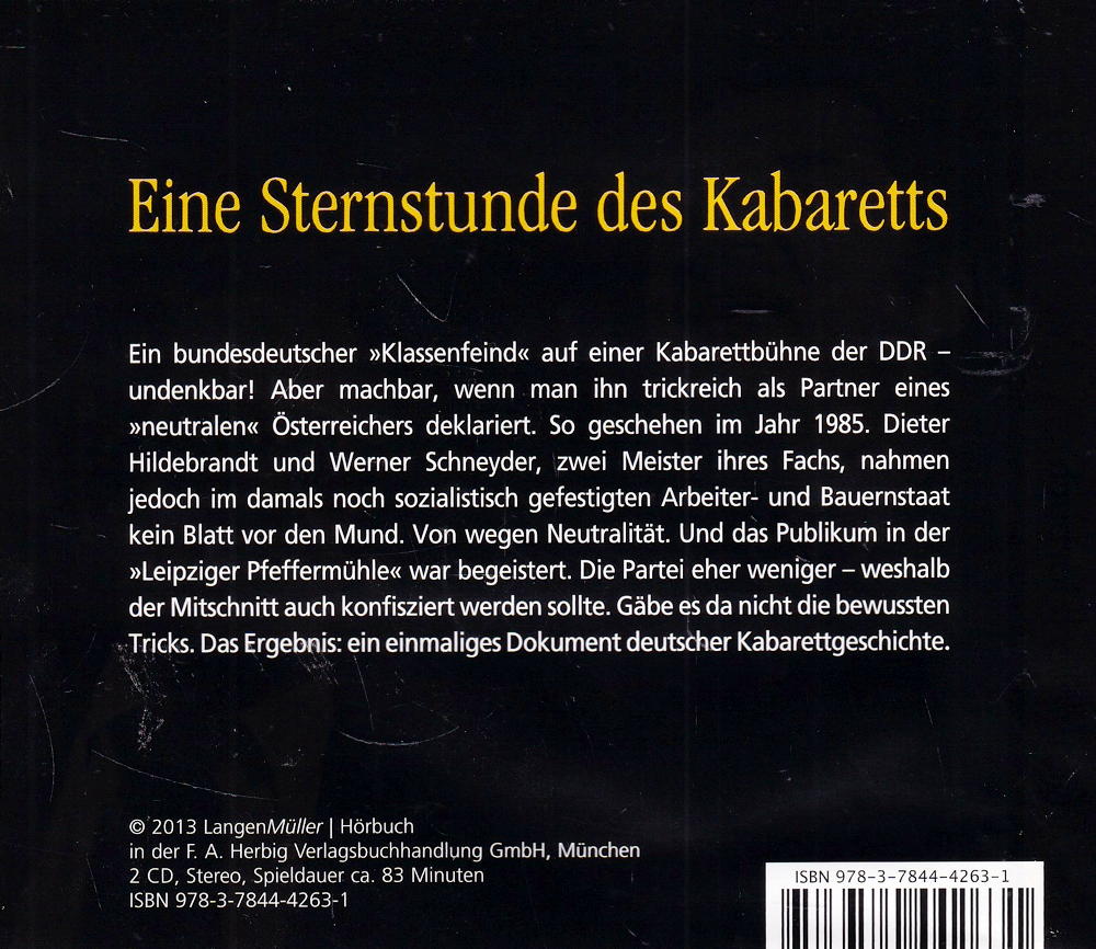 Ein bundesdeutscher »Klassenfeind« auf einer Kabarettbühne der DDR undenkbar! Aber machbar, wenn man ihn trickreich als Partner eines »neutralen« Österreichers deklariert. So geschehen im Jahr 1985. Dieter Hildebrandt und Werner Schneyder, zwei Meister ihres Fachs, nahmen jedoch im damals noch sozialistisch gefestigten Arbeiter- und Bauernstaat kein Blatt vor den Mund. Von wegen Neutralität. Und das Publikum in der »Leipziger Pfeffermühle« war begeistert. Die Partei eher weniger - weshalb der Mitschnitt auch konfisziert werden sollte. Gäbe es da nicht die bewussten Tricks. Das Ergebnis: ein einmaliges Dokument deutscher Kabarettgeschichte.