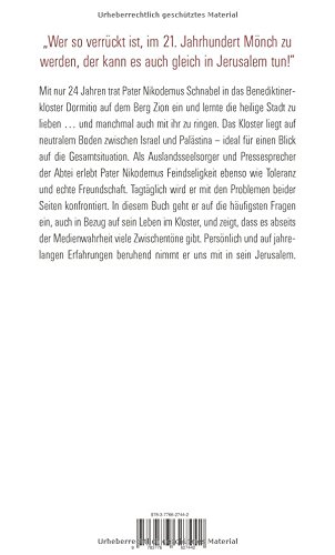 Mit nur 24 Jahren trat Pater Nikodemus Schnabel in das Benediktinerkloster Dormitio auf dem Berg Zion ein und lernte die heilige Stadt zu lieben... Und manchmal auch mit ihr zu ringen. Das Kloster liegt auf neutralem Boden zwischen Israel und Palästina – ideal für einen Blick auf die Gesamtsituation. Als Auslandsseelsorger und Pressesprecher der Abtei erlebt Pater Nikodemus Feindseligkeit ebenso wie Toleranz und echte Freundschaft. Tagtäglich wird er mit den Problemen beider Seiten konfrontiert. In diesem Buch geht er auf die häufigsten Fragen ein, auch in Bezug auf sein Leben im Kloster, und zeigt, dass es abseits der Medienwahrheit viele Zwischentöne gibt. Persönlich und auf jahrelangen Erfahrungen beruhend nimmt er uns mit in sein Jerusalem.
