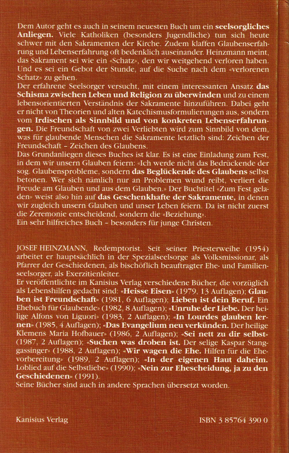 Das Grundanliegen dieses Buches ist klar. Es ist eine Einladung zum Fest, in dem wir unsern Glauben feiern: «Ich werde nicht das Bedrückende der sog. Glaubensprobleme, sondern das Beglückende des Glaubens selbst betonen. Wer sich nämlich nur an Problemen wund reibt, verliert die Freude am Glauben und aus dem Glauben. » Der Buchtitel «Zum Fest geladen» weist also hin auf das Geschenkhafte der Sakramente, in denen wir zugleich unsern Glauben und unser Leben feiern. Da ist nicht zuerst die Zeremonie entscheidend, sondern die «Beziehung».