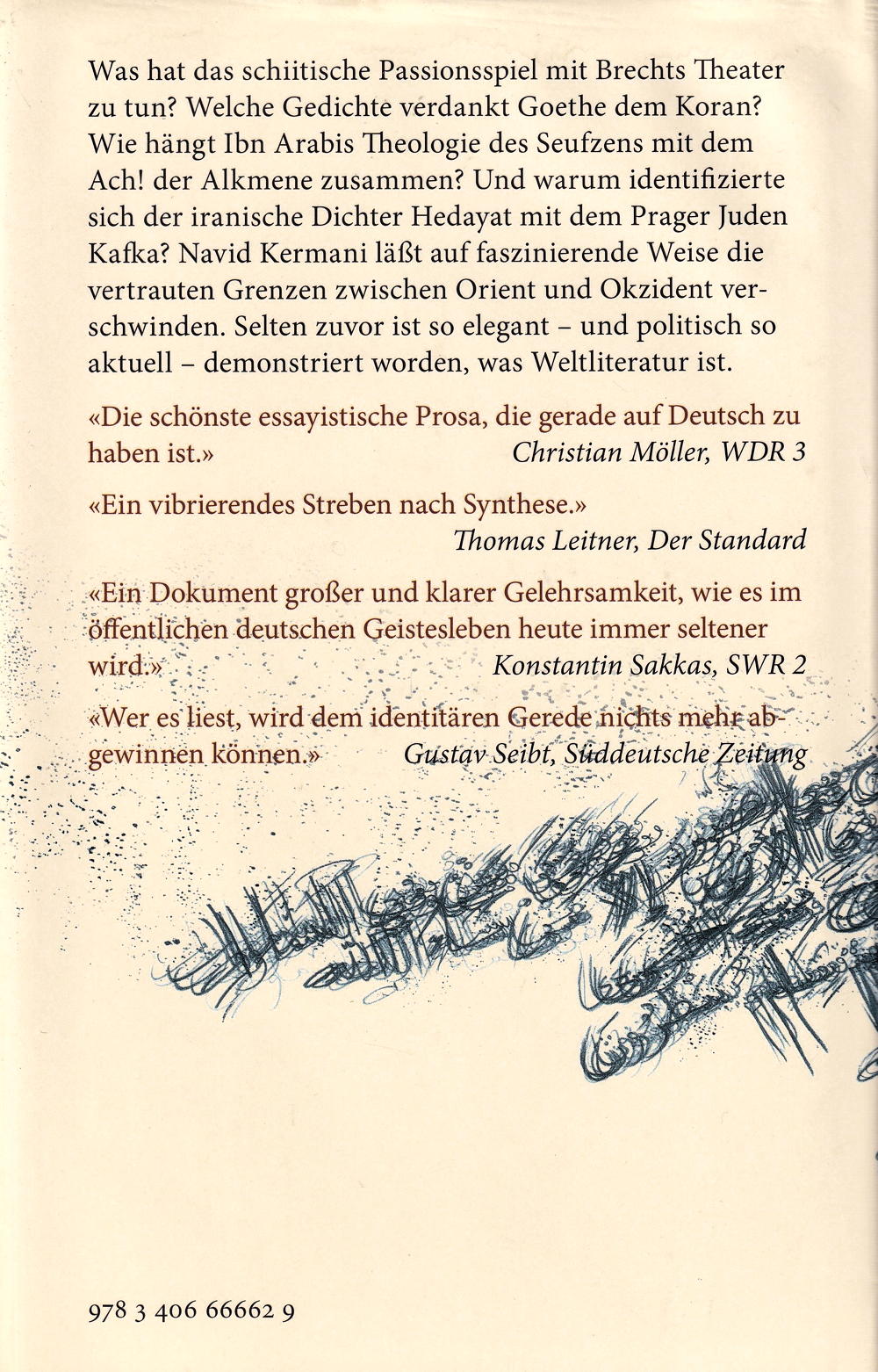 Was hat das schiitische Passionsspiel mit Brechts Theater zu tun? Welche Gedichte verdankt Goethe dem Koran? Wie hängt Ibn Arabis Theologie des Seufzens mit dem Ach! der Alkmene zusammen? Und warum identifizierte sich der iranische Dichter Hedayat mit dem Prager Juden Kafka? Navid Kermani lässt auf faszinierende Weise die vertrauten Grenzen zwischen Orient und Okzident verschwinden. Selten zuvor ist so elegant und politisch so aktuell demonstriert worden, was Weltliteratur ist. Wer sich selbst und andere kennt, Wird auch hier erkennen: Orient und Okzident, Sind nicht mehr zu trennen. Navid Kermani nimmt Goethes berühmten Vers beim Wort. Er liest den Koran als poetischen Text, öffnet die östliche Literatur für westliche Leser, entdeckt die mystische Dimension in den Werken Goethes und Kleists und erschliesst die politische Bedeutung des Theaters von Shakespeare über Lessing bis Brecht. Der Name Navid Kermani steht für eine literarische Weltläufigkeit, die ihre Gegner kennt: Das sind alle, die Religionen und Kulturen mit Gewalt voneinander abschotten, sie gegeneinander ausspielen wollen. Die persönliche Aneignung der Klassiker verleiht seinen Texten jene aktuelle Brisanz, die Weltliteratur noch dort ausmacht, wo sie von den privatesten Gefühlen erzählt. Denn um Liebe geht es Zwischen Koran und Kafka selbstverständlich auch.