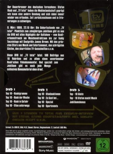 Der Dauerbrenner des deutschen Fernsehens: Stefan Raab und TV total haben die Medienlandschaft geprägt wie kaum eine andere Sendung und sich dabei immer wieder neu erfunden. Zeit zurückzuschauen und in Erinnerungen zu schwelgen. 8. März 1999, 22. 15 Uhr: Die Geburtsstunde von TV total. Pünktlich zum zehnjährigen Jubiläum gibt es nun die DVD mit allen Highlights der Kultshow - vom Knallerbsenstrauch am Maschendrahtzaun bis zur funky Tanzeinlage mit Soulgrösse James Brown. Mit den grössten Stars aus Musik und Entertainment, den schrägsten Gästen, den skurrilsten TV-Ausschnitten u. v. m. Diese DVD ist TV total total: 100 Beiträge aus 10 Rubriken und zu allem einen unverkennbar Raab'schen Videokommentar. Und speziell zum Jubiläum gibt es noch jede Menge exklusives Bonusmaterial oben drauf.