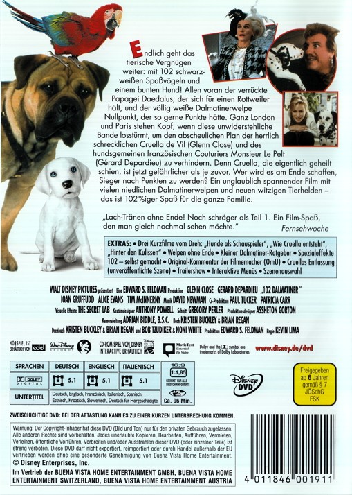 Endlich geht das tierische Vergnügen weiter: mit 102 schwarzweissen Spassvögeln und einem bunten Hund! Allen voran der verrückte Papagei Daedalus, der sich für einen Rottweiler hält, und der völlig weissen Dalmatinerwelpe Nullpunkt, der so gerne Punkte hätte. Ganz London und Paris stehen Kopf, wenn diese unwiderstehliche Bande losstürmt, um den abscheulichen Plan der herrlich schrecklichen Cruella de Vil und des hundsgemeinen französischen Couturiers Monsieur Le Pelt zu verhindern. Denn Cruella, die eigentlich geheilt schien, ist jetzt gefährlicher als je zuvor. Wer wird es am Ende schaffen, Sieger nach Punkten zu werden? Ein unglaublich spannender Film mit vielen witzigen, niedlichen Tierhelden.