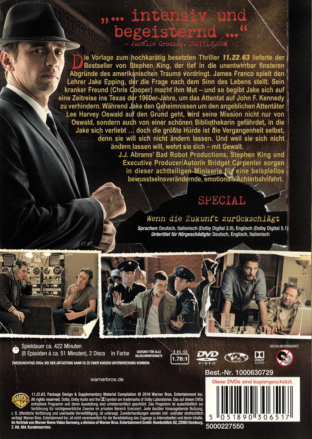 Die Vorlage zum hochkarätig besetzten Thriller 11.22.63 lieferte der Bestseller von Stephen King, der tief in die unentwirrbar finsteren Abgründe des amerikanischen Traums vordringt. James Franco spielt den Lehrer Jake Epping, der die Frage nach dem Sinn des Lebens stellt. Sein kranker Freund macht ihm Mut - und so begibt Jake sich auf eine Zeitreise ins Texas der 1960er-Jahre, um das Attentat auf John F. Kennedy zu verhindern. Während Jake den Geheimnissen um den angeblichen Attentäter Lee Harvey Oswald auf den Grund geht, wird seine Mission nicht nur von Oswald, sondern auch von einer schönen Bibliothekarin gefährdet, in die Jake sich verliebt... doch die grösste Hürde ist die Vergangenheit selbst, denn sie will sich nicht ändern lassen.