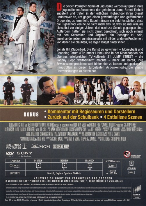 Die beiden Polizisten Schmidt und Jenko werden aufgrund ihres jugendlichen Aussehens der geheimen Jump-Street-Einheit zugeteilt und treten in der örtlichen High-School ihren Dienst undercover an. Schmidt und Jenko tauschen ihre Waffen und Dienstmarken gegen Rucksäcke ein und riskieren ihr Leben, um gegen einen gewalttätigen und gefährlichen Drogenring zu ermitteln. Dabei müssen sie bald feststellen, dass die High-School von heute nicht mehr das ist, was sie mal war, als sie selbst vor einigen Jahren dort noch zur Schule gegangen sind. Ausserdem hatten sie nicht damit gerechnet, sich noch einmal mit den Schrecken und Ängsten, ein Teenager zu sein, auseinandersetzen zu müssen oder mit all den anderen Problemen, von denen sie glaubten, sie lägen längst hinter ihnen...