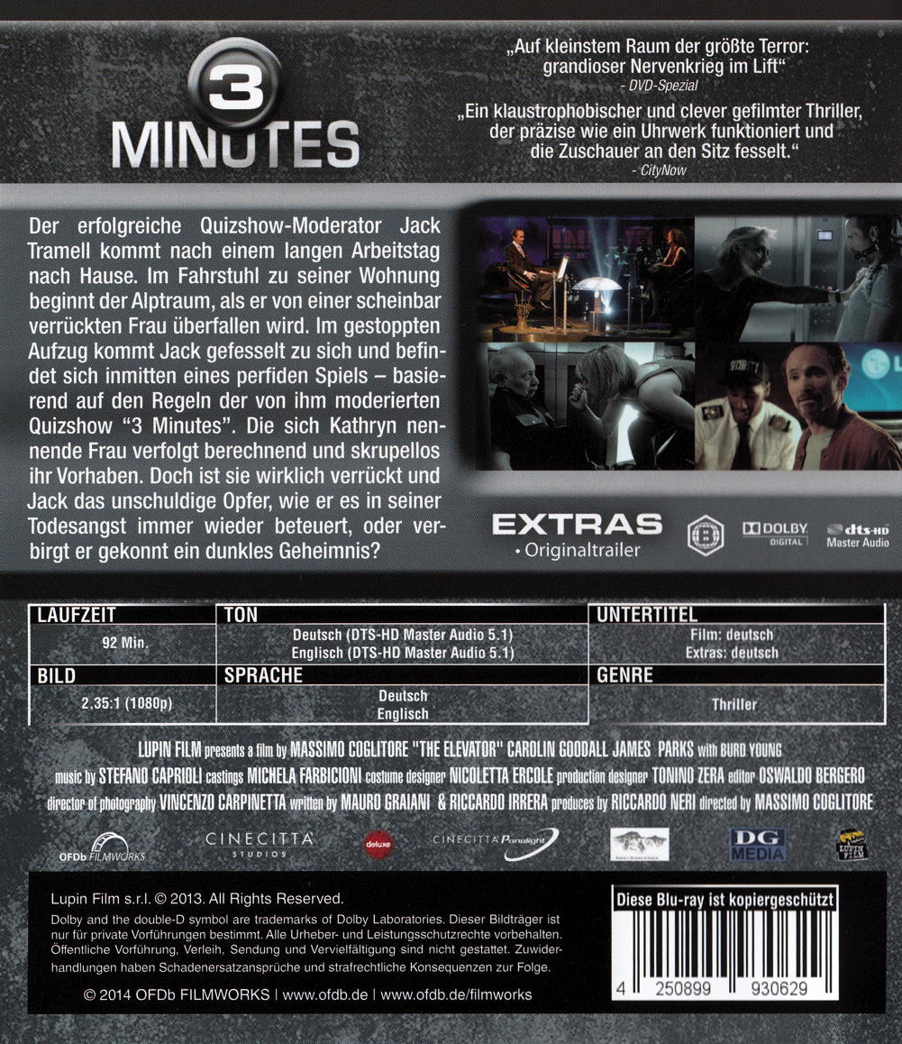 Der erfolgreiche Quizshow-Moderator Jack Tramell kommt nach einem langen Arbeitstag nach Hause. Im Fahrstuhl zu seiner Wohnung beginnt der Alptraum, als er von einer scheinbar verrückten Frau überfallen wird. Im gestoppten Aufzug kommt Jack gefesselt zu sich und befindet sich inmitten eines perfiden Spiels - basierend auf den Regeln der von ihm moderierten Quizshow "3 Minutes". Die sich Kathryn nennende Frau verfolgt berechnend und skrupellos ihr Vorhaben. Doch ist sie wirklich verrückt und Jack das unschuldige Opfer, wie er es in seiner Todesangst immer wieder beteuert, oder verbirgt er gekonnt ein dunkles Geheimnis?