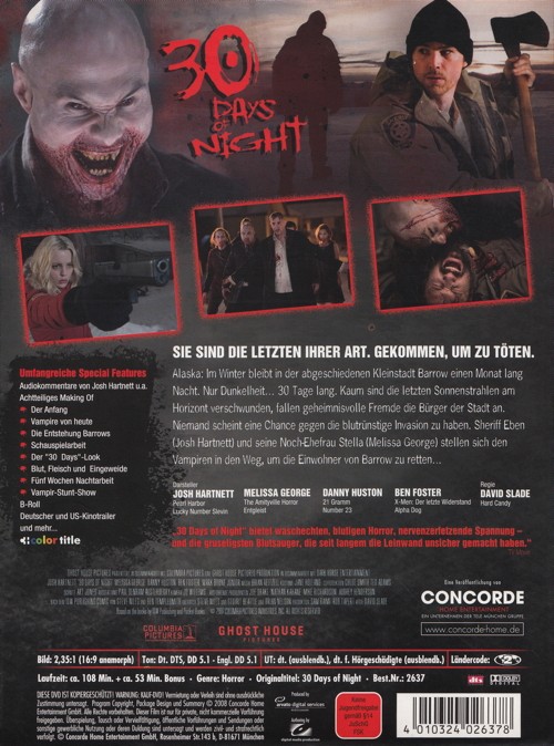 Alaska: Im Winter bleibt in der abgeschiedenen kleinstadt Barrow einen Monat lang Nacht. Nur Dunkelheit... 30 Tage lang. kaum sind die letzten Sonnenstrahlen am Horizont verschwunden, fallen geheimnisvolle Fremde die Bürger der Stadt an. Niemand scheint eine Chance gegen die blutrünstige Invasion zu haben. Sheriff Eben (Josh Hartnett) und seine Noch-Ehefrau Stella (Melissa George) stellen sich den Vampiren in den Weg, um die Einwohner von Barrow zu retten...