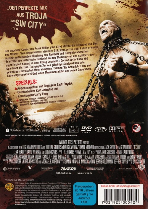 Der epochale Comic von Frank Miller stürmt die Leinwand mit Blut und Donner. Sein ungezähmter visueller Stil, werkgetreu zum Leben erweckt in einer mitreissenden Mischung aus Realfilm und Computeranimation. Er erzählt die Schlacht an den Thermopylen und schildert den gigantischen Kampf, in dem König Leonidas und 300 Spartaner bis zum Tod gegen Xerxes und sein gewaltiges persisches Heer kämpften. Erleben Sie Geschichte aus der Schwertperspektive! Und einen Monumentalfilm der neuen Generation.