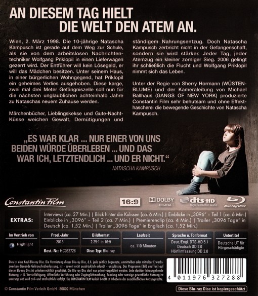 Wien, 2. März 1998. Die 10-jährige Natascha Kampusch ist auf dem Weg zur Schule, als sie von dem arbeitslosen Nachrichtentechniker Wolfgang Priklopil in einem Lieferwagen gezerrt wird. Unter seinem Haus hat er bereits ein geheimes Verlies ausgehoben. Diese karge, winzige Gefängniszelle soll nun für die nächsten achteinhalb Jahre zu Nataschas neuen Zuhause werden. Doch das Mädchen zerbricht nicht in der Gefangenschaft, sie wird stärker. Mit jedem Tag. Mit jedem Atemzug. 2006 gelingt ihr schließlich die Flucht und Wolfgang Priklopil nimmt sich das Leben.