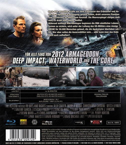 Nach dem gewaltige Kräfte aus dem Erdinneren den Erdmantel und damit die Erdplatten in Bewegung gesetzt haben, droht unserem Planeten eine Zerstörung im biblischem Ausmaß. Die Meeresspiegel steigen weltweit. Es droht eine zweite Sintflut. Während weltweit Mikrobiologen beginnen die DNA sämtlicher Lebensformen zu sichern, wird unter der Leitung des US-Militärs eine riesige ARCHE für 50.000 Menschen gebaut, die die Apokalypse überleben sollen. Wer aber sollen die Auserwählten sein… oder kann man das Ende doch noch aufhalten?