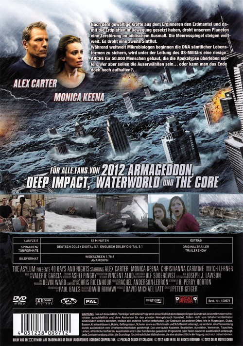 Nach dem gewaltige Kräfte aus dem Erdinneren den Erdmantel und damit die Erdplatten in Bewegung gesetzt haben, droht unserem Planeten eine Zerstörung im biblischem Ausmaß. Die Meeresspiegel steigen weltweit. Es droht eine zweite Sintflut. Während weltweit Mikrobiologen beginnen die DNA sämtlicher Lebensformen zu sichern, wird unter der Leitung des US-Militärs eine riesige ARCHE für 50.000 Menschen gebaut, die die Apokalypse überleben sollen. Wer aber sollen die Auserwählten sein… oder kann man das Ende doch noch aufhalten?