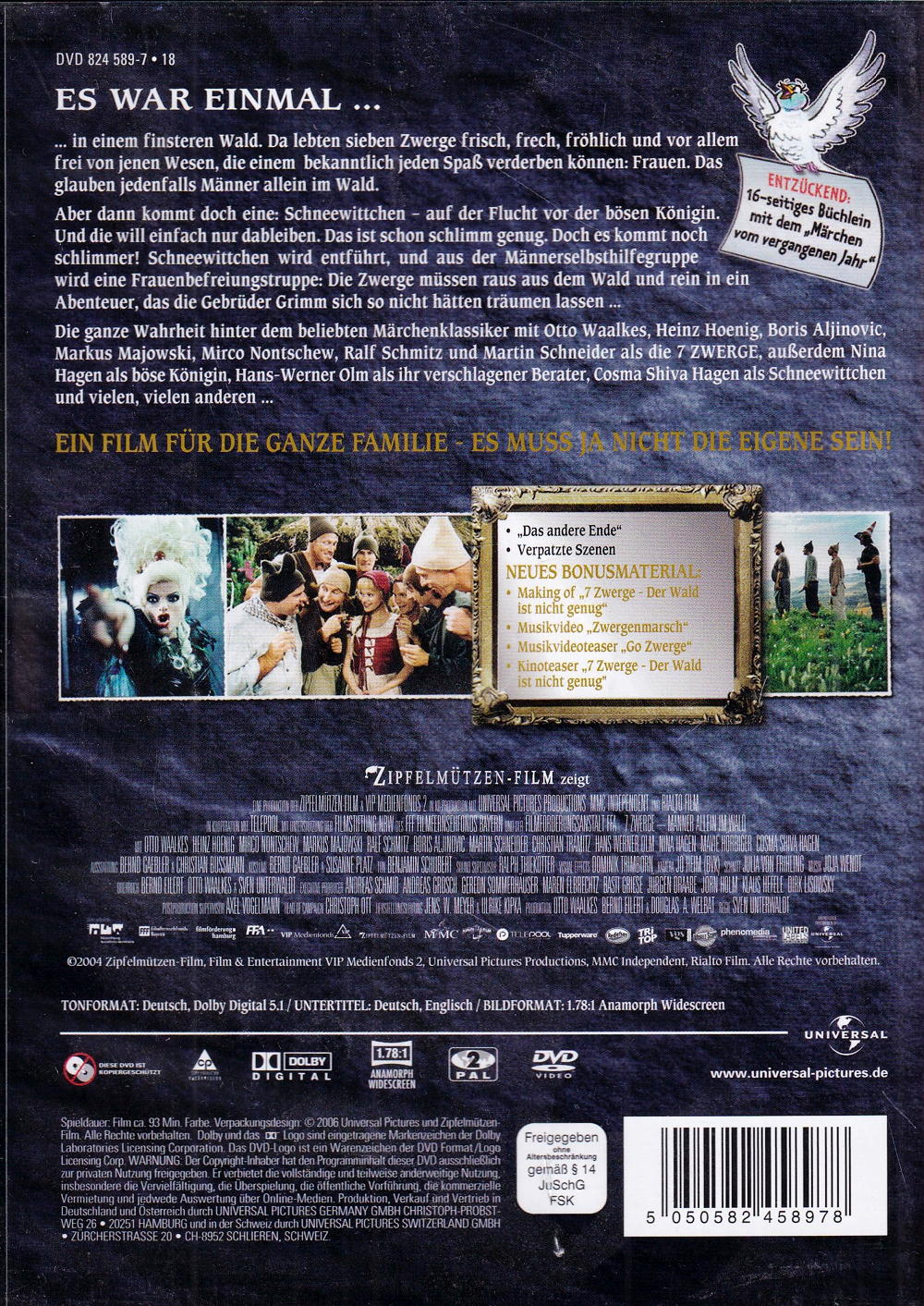Die ganze Wahrheit hinter dem beliebten Märchenklassiker, mit Otto Waalkes, Heinz Hoenig, Boris Aljinovic, Markus Majowski, Mirko Nontschew, Ralf Schmitz und Martin Schneider als die '7 Zwerge', ausserdem Nina Hagen als böse Königin, Hans Werner Olm als ihr verschlagener Berater, Cosma Shiva Hagen als Schneewittchen und vielen, vielen anderen. Ein Film für die ganze Familie - es muss ja nicht die eigene sein!