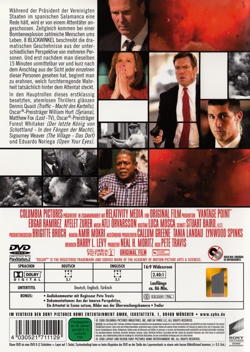 Während der Präsident der Vereinigten Staaten im spanischen Salamanca eine Rede hält, wird er von einem Attentäter angeschossen. Zeitgleich kommen bei einer Bombenexplosion zahlreiche Menschen ums Leben. 8 Blickwinkel beschreibt die dramatischen Geschehnisse aus der unterschiedlichen Perspektive von mehreren Personen. Und erst nachdem man die selben 15 Minuten unmittelbar vor und kurz nach dem Anschlag gesehen hat, beginnt man zu erahnen, welch furchterregende Wahrheit tatsächlich hinter dem Attentat steckt.