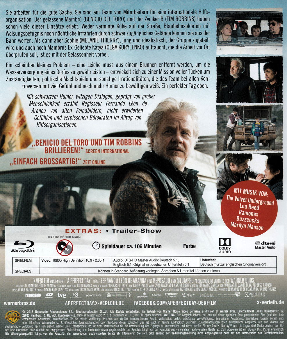 Sie arbeiten für die gute Sache. Sie sind ein Team von Mitarbeitern für eine internationale Hilfsorganisation. Der gelassene Mambrú und der Zyniker B haben schon viele dieser Einsätze erlebt. Weder verminte Kühe auf der Strasse, Blauhelmsoldaten mit Weisungsbefugnis noch nächtliche Irrfahrten durch schwer zugängliches Gelände können sie aus der Bahn werfen. Als dann aber Sophie, jung und idealistisch, der Gruppe zugeteilt wird und auch noch Mambrús Ex-Geliebte Katya auftaucht, die die Arbeit vor Ort überprüfen soll, ist es mit der Gelassenheit vorbei. Ein scheinbar kleines Problem - eine Leiche muss aus einem Brunnen entfernt werden, um die Wasserversorgung eines Dorfes zu gewährleisten - entwickelt sich zu einer Mission voller Tücken um Zuständigkeiten, politische Machtspiele und sonstige Irrationalitäten, die das Team bei allen Kontroversen mit viel Gefühl und noch mehr Humor zu bewältigen weiss. Ein perfekter Tag eben.