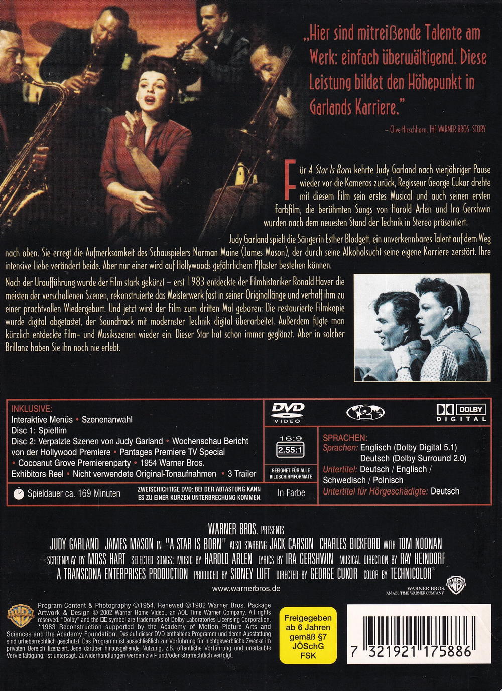 Für "A Star is Born" kehrt Judy Garland nach vierjähriger Pause wieder vor die Kamera zurück, Regisseur George Cukor drehte mit diesem Film sein erstes Musical und auch sinen ersten Farbfilm, die berühmten Songs von Harold Arlen und Ira Gershwin wurden nach dem neuesten Stand der Technik in Stereo präsentiert. Judy Garland spielt die Sängerin Esther Blodgett, ein unverkennbares Talent auf dem Weg nach oben. Sie erregt die Aufmerksamkeit des Schauspielers Norman Maine, der durch seine Alkoholsucht seine eigene Karriere zerstört. Ihre intensive Liebe verändert beide. Aber nur einer wird auf Hollywoods gefährlichem Pflaster bestehen können. Nach der Uraufführung wurde der Film stark gekürzt - erst 1983 entdeckte der Filmhistoriker Ronald Haver die meisten der verschollenen Szenen, rekonstruierte das Meisterwerk fast in seiner Originallänge und verhalf ihm zu einer prachtvollen Wiedergeburt. Und jetzt wird der Film zu dritten Mal geboren: Die restaurierte Filmkopie wurde digital abgetastet, der Soundtrack mit modernster Technik digital überarbeitet. Ausserdem fügte man kürzlich entdeckte Film- und Musikszenen wieder ein. Dieser Star hat schon immer geglänzt. Aber in solcher Brillanz haben Sie ihn noch nie erlebt.
