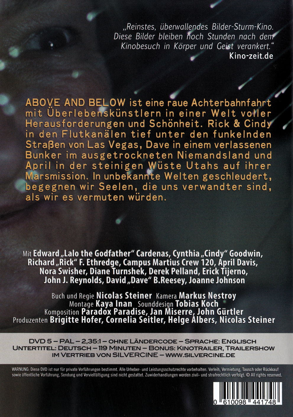 Vom Mars. Auf die Erde. Unter die Oberfläche. Above and below ist eine raue Achterbahnfahrt mit Überlebenskünstlern in einer Welt voller Herausforderungen und Schönheit. Rick & Cindy in den Flutkanälen tief unter den funkelnden Strassen von Las Vegas, Dave in einem verlassenen Bunker im ausgetrockneten Niemandsland und April in der steinigen Wüste Utahs auf ihrer Marsmission. In unbekannte Welten geschleudert, begegnen wir Seelen, die uns verwandter sind, als wir es vermuten würden.
