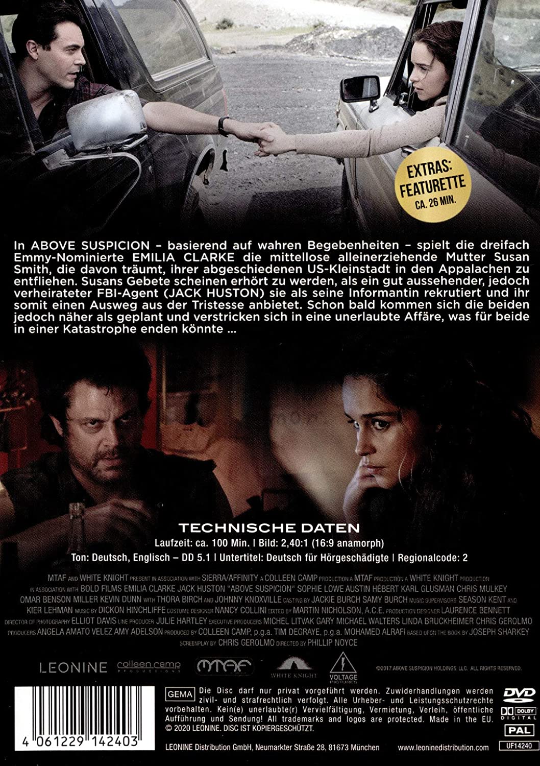 In ABOVE SUSPICION – basierend auf wahren Begebenheiten – spielt die dreifach Emmy-Nominierte EMILIA CLARKE die mittellose alleinerziehende Mutter Susan Smith, die davon träumt, ihrer abgeschiedenen US-Kleinstadt in den Appalachen zu entfliehen. Susans Gebete scheinen erhört zu werden, als ein gut aussehender, jedoch verheirateter FBI-Agent (JACK HUSTON) sie als seine Informantin rekrutiert und ihr somit einen Ausweg aus der Tristesse anbietet. Schon bald kommen sich die beiden näher als geplant und verstricken sich in eine unerlaubte Affäre, was für beide in einer Katastrophe enden könnte …