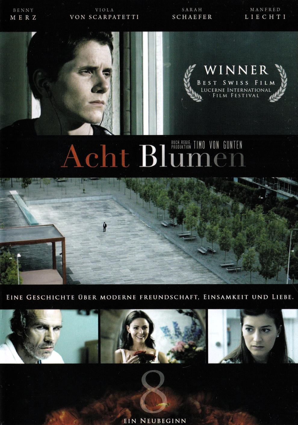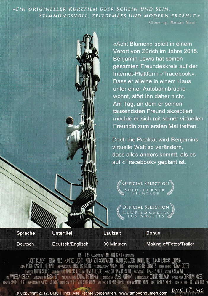 «Acht Blumen» spielt in einem Vorort von Zürich im Jahre 2015. Benjamin Lewis hat seinen gesamten Freundeskreis auf der Internet-Plattform «Tracebook». Dass er alleine in einem Haus unter einer Autobahnbrücke wohnt, stört ihn daher nicht. Am Tag, an dem er seinen tausendsten Freund akzeptiert, möchte er sich mit seiner virtuellen Freundin zum ersten Mal treffen. Doch die Realität wird Benjamins virtuelle Welt so verändern, dass alles anders kommt, als es auf « Tracebook» geplant ist.