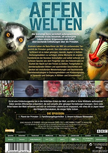 Erstmals haben die Naturfilmer der BBC ein umfassendes Tierporträt der Primaten gedreht. Den international erfahrenen Naturfilmern ist es dabei gelungen, rasende Jagden in tiefsten Dschungelwäldern zu verfolgen, intime Momente im engsten Familienkreis der Bonobos festzuhalten und selbst seltenen und scheuen Spezies wie dem Fingertier oder den Koboldmakis im Dunkel der Nacht auf den Fersen zu bleiben. Festgehalten in atemberaubenden Bildern und spannenden Geschichten entdecken wir evolutionäre Meisterleistungen und faszinierende Überlebensstrategien in Dschungelwäldern und Küstenregionen, in Savannen und Gebirgen, in Höhlen- und Schneewelten. Es ist eine Entdeckungsreise bis in die hintersten Ecken der Welt, um Affen in freier Wildbahn aufzuspüren. Dabei werden Affenwelten präsentiert, die sich jenseits aller gängigen Vorstellungen bewegen. Die dreiteilige Serie vermittelt aussergewöhnliche Einblicke in das fesselnde, oft verborgene Leben unserer Artgenossen und liefert überraschende Enthüllungen über die Primaten.