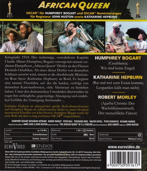 Während des ersten Weltkrieges fliehen die altjüngferlich-spröde Missionarstochter Rose Sayer und der rauhbeinige, trinkfeste Kapitän Charlie Allnutt auf dessen veraltetem Schiff aus Deutsch-Ostafrika vor den Deutschen. Nach anfänglichen Schwierigkeiten halten die beiden doch zusammen und aus gegenseitiger Abneigung entwickelt sich eine Romanze.