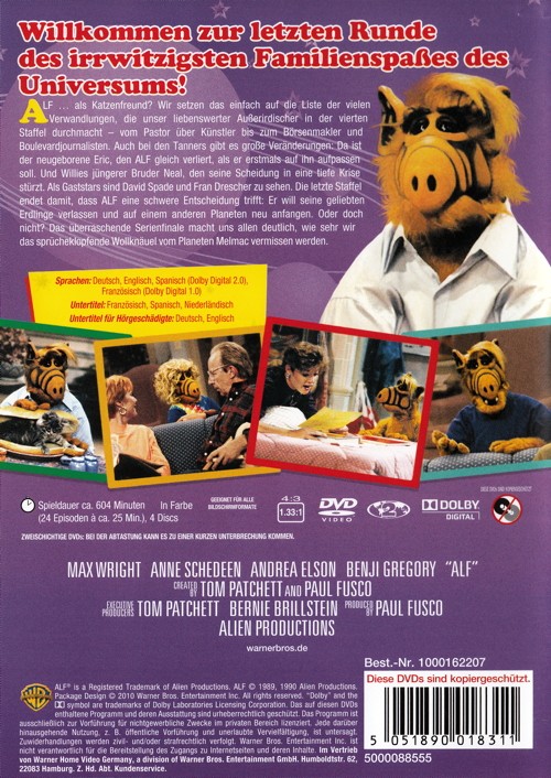 ALF... als Katzenfreund? Wir setzen das einfach auf die Liste der vielen Verwandlungen, die unser liebenswerter Ausserirdischer in der vierten Staffel durchmacht - vom Pastor über Künstler bis zum Börsenmakler und Boulevardjournalisten. Auch bei den Tanners gibt es grosse Veränderungen: Da ist der neugeborene Eric, den ALF gleich verliert, als er erstmals auf ihn aufpassen soll. Und Willies jüngerer Bruder Neal, den seine Scheidung in eine tiefe Krise stürzt. Als Gaststars sind David Spade und Fran Drescher zu sehen. Die letzte Staffel endet damit, dass ALF eine schwere Entscheidung trifft: Er will seine geliebten Erdlinge verlassen und auf einem anderen Planeten neu anfangen. Oder doch nicht? Das überraschende Serienfinale macht uns allen deutlich, wie sehr wir das sprücheklopfende Wollknäuel von Melmac vermissen werden.