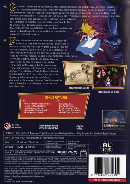 Suivez Alice à la poursuite du Lapin Blanc au cours de ce voyage magique dans le monde fantastiquedu Pays des Merveilles. C’est un endroit sens dessus dessous qui devient "de plus en plus curieux" au fur et à mesure qu'Alice rencontre des personnages vraiment inoubliables : le Chapelier Fou, Le Lièvre de Mars, Tweedle Dee et Tweedle Dum, le Chat de Chester, la Reine de Coeur et bien d’autres encore. Regorgeant de chansons spectaculaires et d’animations étonnantes, Alice au Pays des Merveilles l'Edition Spéciale est un classique intemporel pour toute la famille.