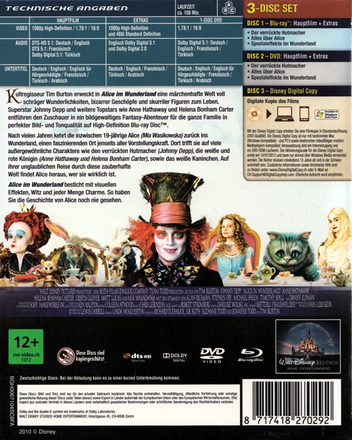 Kultregisseur Tim Burton erweckt in Alice im Wunderland eine märchenhafte Welt voll schräger Wunderlichkeiten, bizarrer Geschöpfe und skurriler Figuren zum Leben. Superstar Johnny Depp und weitere Topstars wie Anne Hathaway und Helena Bonham Carter entführen den Zuschauer in ein bildgewaltiges Fantasy-Abenteuer für die ganze Familie.