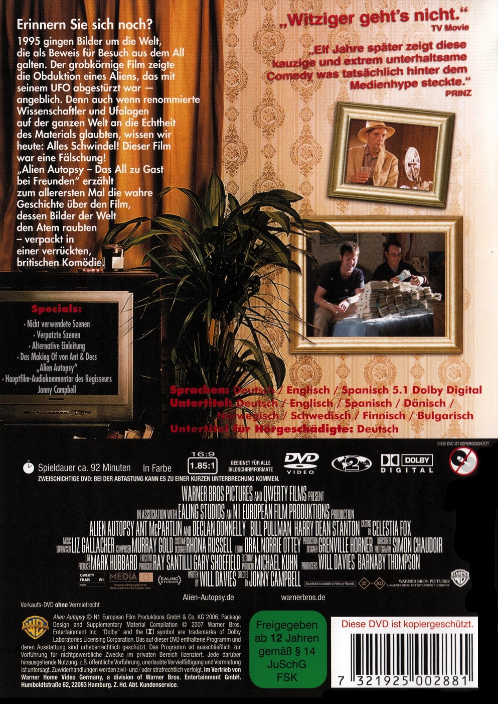 1995 gingen Bilder um die Welt, die als Beweis für Besuch aus dem All galten. Der grobkörnige Film zeigte die Obduktion eines Aliens, das mit seinem UFO abgestürzt sei - angeblich. Denn auch wenn führende Wissenschaftler und Ufologen auf der ganzen Welt an die Echtheit des Materials glaubten, wissen wir heute: Alles Schwindel! Der Film war eine Fälschung! "Alien Autopsy - Das All zu Gast bei Freunden" erzählt zum allerersten Mal die wahre Geschichte über den Film, dessen Bilder der Welt den Atem raubten - verpackt in einer sympathischen, britischen Komödie!
