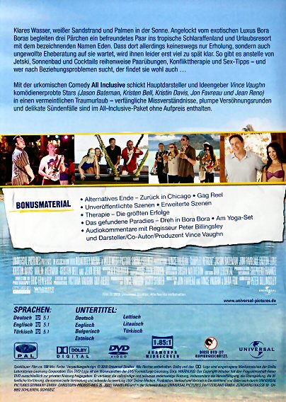 Mit der urkomischen Comedy All Inclusive schickt Hauptdarsteller und Ideengeber Vince Vaughn komödienerprobte Stars (Jason Bateman, Kristen Bell, Kristin Davis, Jon Favreau und Jean Reno) in einen vermeintlichen Traumurlaub – verfängliche Missverständnisse, plumpe Versöhnungsrunden und delikate Sündenfälle sind im All-Inclusive-Paket ohne Aufpreis enthalten.